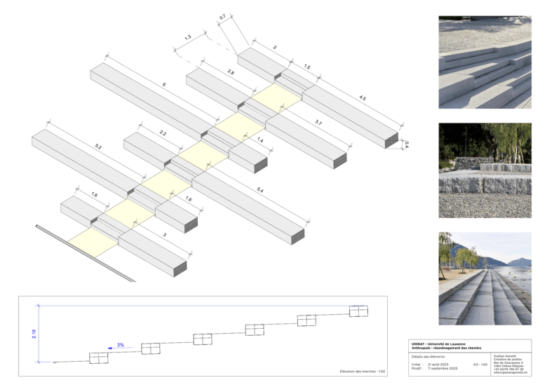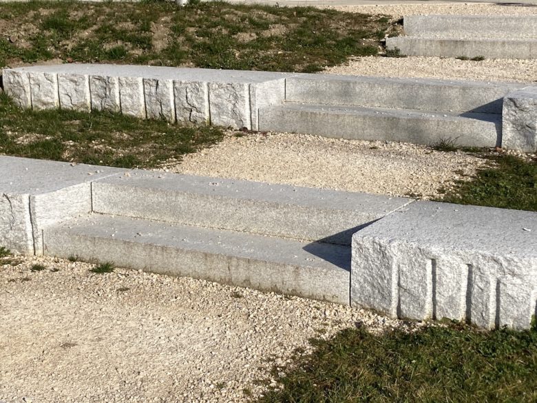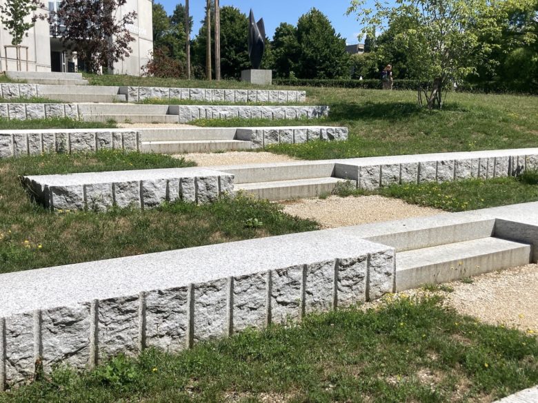 Réhabilitation d’une rampe d’accès en marches d’escaliers, pentes douces et gradins. Plantation d’arbres pour ombrager l’espace et en faire un lieu de repos.